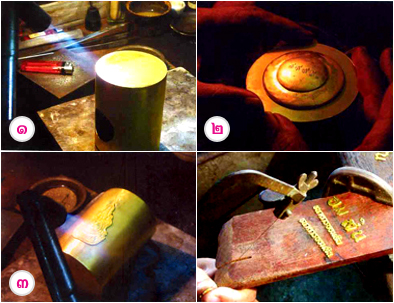๑. ช่างทองนำทองคำมาหลอมแล้วนำเข้าเครื่องรีดเป็น แผ่นจากนั้นนำมาเชื่อมเป็นทรงกระบอกตามขนาดที่ กำหนด