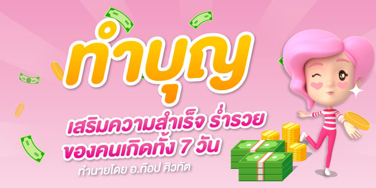 —————————————————— ควรทำบุญไหว้พระองค์ใหญ่ ที่ตั้งอยู่กลางแจ้งหรือในพระอุโบสถ เช่น พระพุทธไสยาสน์ วัดโพธิ์ พระพุทธรูปองค์ใหญ่ วัดม่วง จังหวัดอ่างทอง ขอพรความหนักแน่นและความสำเร็จและการเงินที่ยิ่งใหญ่ที่มีโอกาสสร้างบุญกุศลด้วยการก่อสร้างถาวรวัตถุ สร้างพระอุโบสถ อาคารเรียน สร้างโรงพยาบาล เพราะคนวันนี้ต้องการเสริมความมั่นคงและมั่งคั่งแก่ตนเองเป็นพิเศษ เคล็ดลับ ใส่เครื่องประดับสีม่วง เสื้อผ้าสีม่วง เสริมพลังความกระตือรือร้นและแรงบันดาลใจได้ดี |