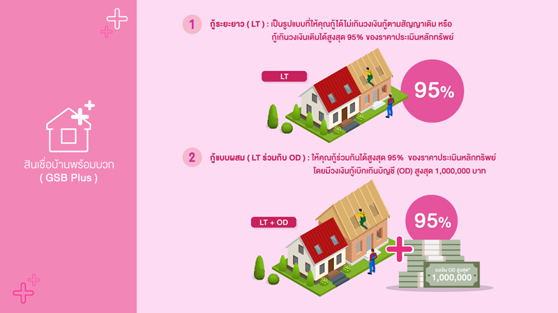 Plus เงินเพิ่มให้ลูกค้าเคหะเดิม ประวัติดี ที่อยากกู้เพิ่มเติม คุณเองก็สามารถบวกเพิ่มความสุขด้วยสินเชื่อ GSB PLUS ได้ง่ายๆ เพียงติดต่อที่ธนาคารออมสินทุกสาขาทั่วประเทศ หรือ โทรฯ สอบถามเพิ่มเติมที่ GSB Call Center 1115