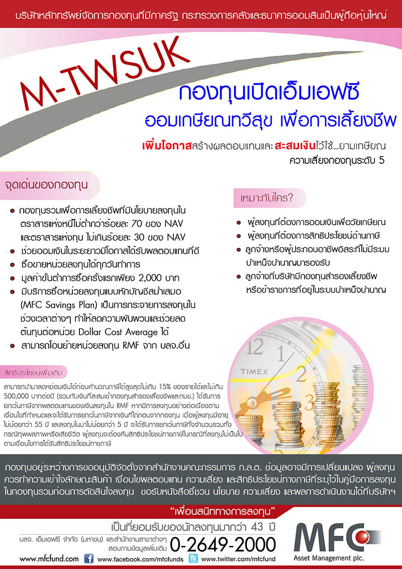 หน้าหลัก > News > ข่าวประชาสัมพันธ์ > กองทุนเปิดเอ็มเอฟซี ออมเกษียณทวีสุข เพื่อการเลี้ยงชีพ