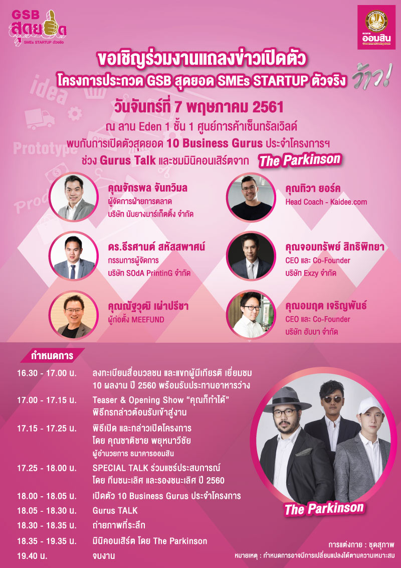 ขอเชิญร่วมงานแถลงข่าวเปิดตัว โครงการประกวด GSB สุดยอด SMEs STARTUP ตัวจริง ว้าว! - ธนาคารออมสิน