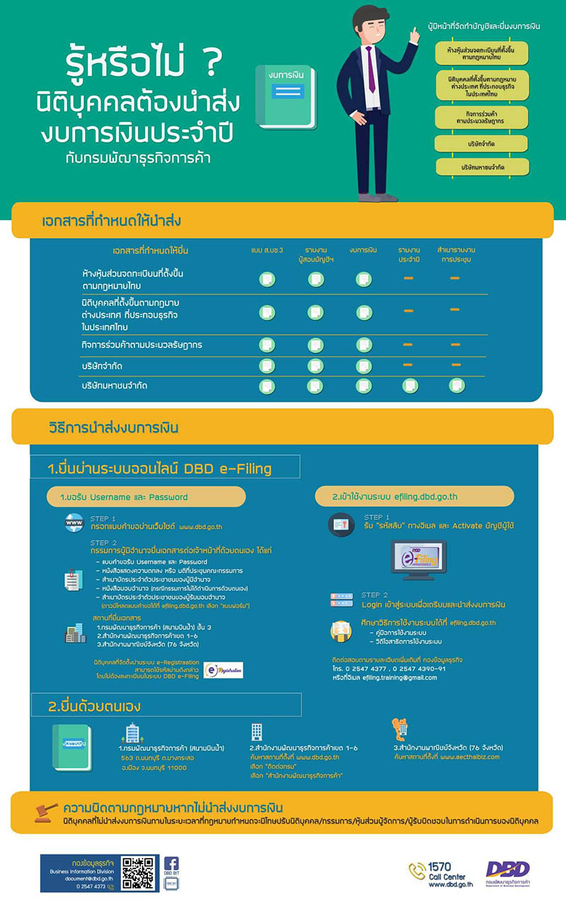 พระราชบัญญัติการบัญชี พ.ศ. 2543 ได้กำหนดให้นิติบุคคล ประเภท ห้างหุ้นส่วนจดทะเบียน บริษัทจำกัด บริษัทมหาชนจำกัด นิติบุคคลที่ตั้งขึ้นตามกฎหมายต่างประเทศที่ประกอบธุรกิจในประเทศไทย และกิจการร่วมค้าตามประมวลรัษฎากร ที่มีรอบปีบัญชีสิ้นสุดวันที่ 31 ธันวาคม 2560 มีหน้าที่นำส่งงบการเงินและบัญชีรายชื่อผู้ถือหุ้นผ่านทางอิเล็กทรอนิกส์ (DBD e-Filing) ภายในวันที่ 31 พฤษภาคม 2561