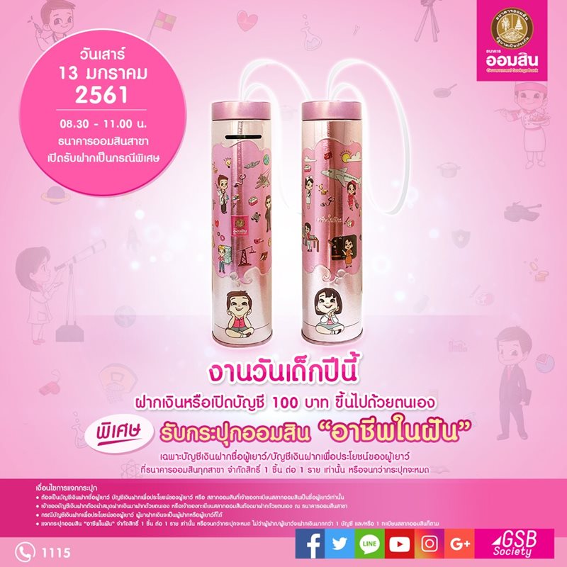 งานวันเด็กปีนี้ฝากเงินหรือเปิดบัญชี 100 บาท ขึ้นไปด้วยตนเอง พิเศษ รับกระปุกออมสิน "อาชีพในฝัน" - ธนาคารออมสิน
