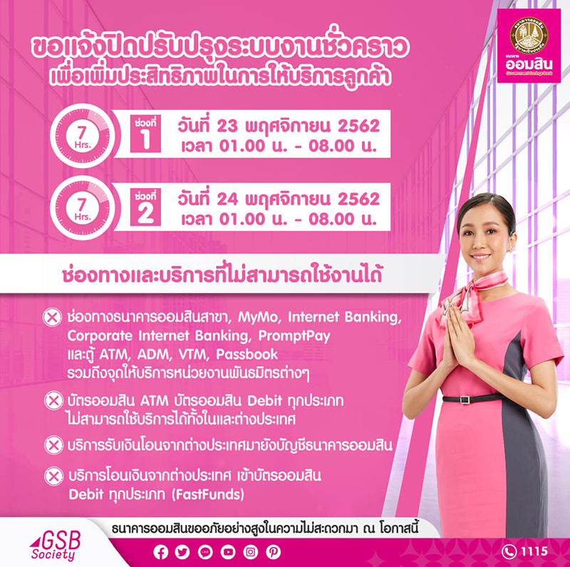 ธนาคารออมสินขอแจ้งปิดปรับปรุงระบบงานชั่วคราวเพื่อเพิ่มประสิทธิภาพในการให้บริการลูกค้า
