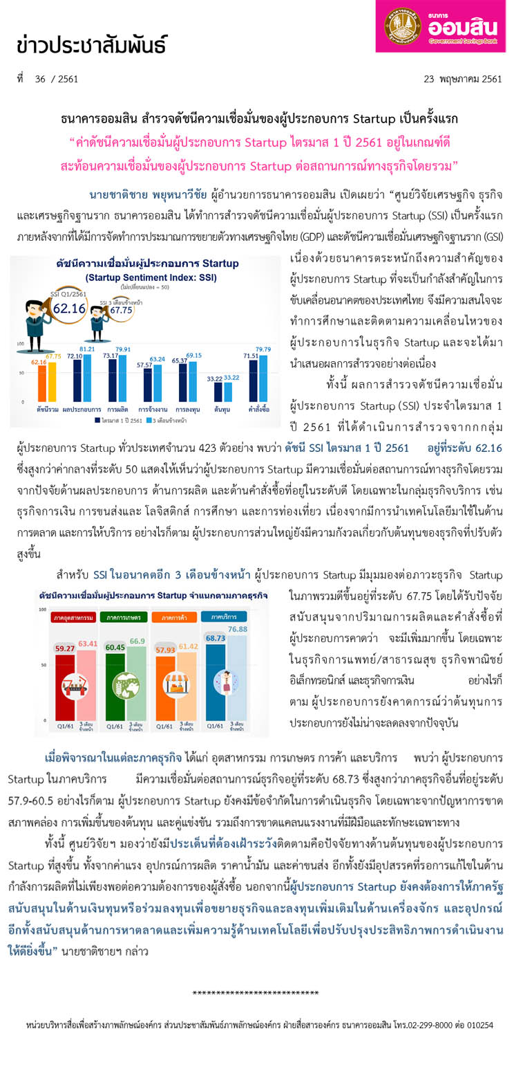 ธนาคารออมสินสำรวจดัชนีความเชื่อมั่นของผู้ประกอบการ Startup เป็นครั้งแรก ค่าดัชนีความเชื่อมั่นผู้ประกอบการ Startup ไตรมาส 1 ปี 2561อยู่ในเกณฑ์ดีสะท้อนความเชื่อมั่นของผู้ประกอบการ Startup ต่อสถานการณ์ทางธุรกิจโดยรวม