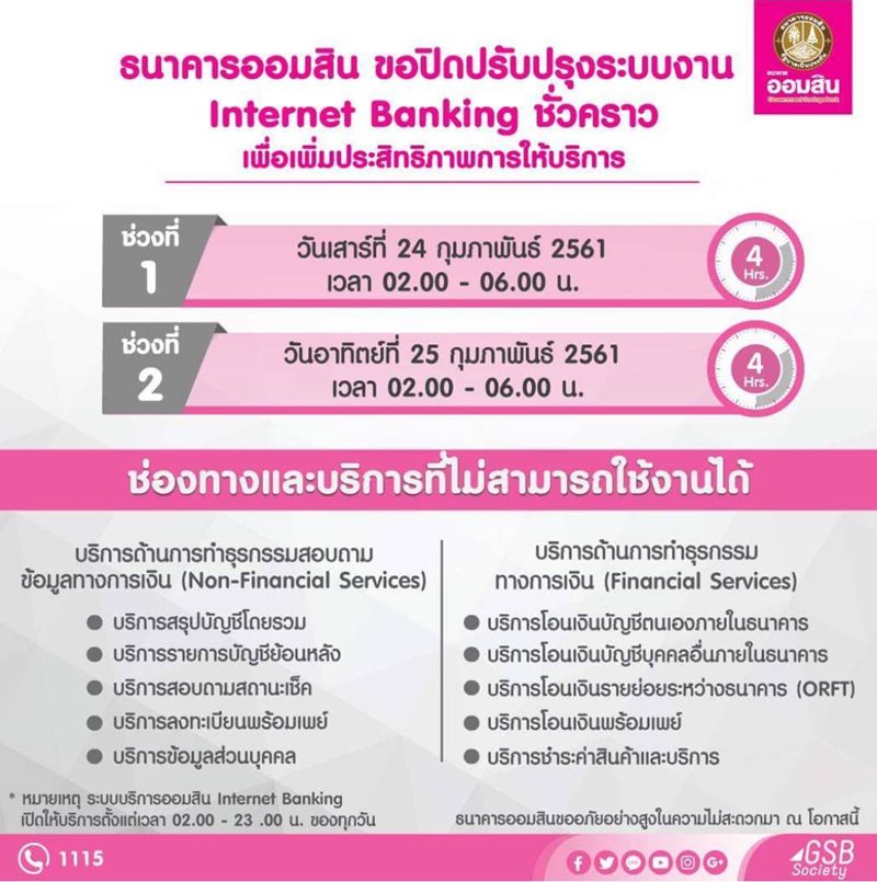 ธนาคารออมสิน ขอแจ้งปิดปรับปรุงระบบงาน Internet Banking ชั่วคราวเพื่อเพิ่มประสิทธิภาพการให้บริการ