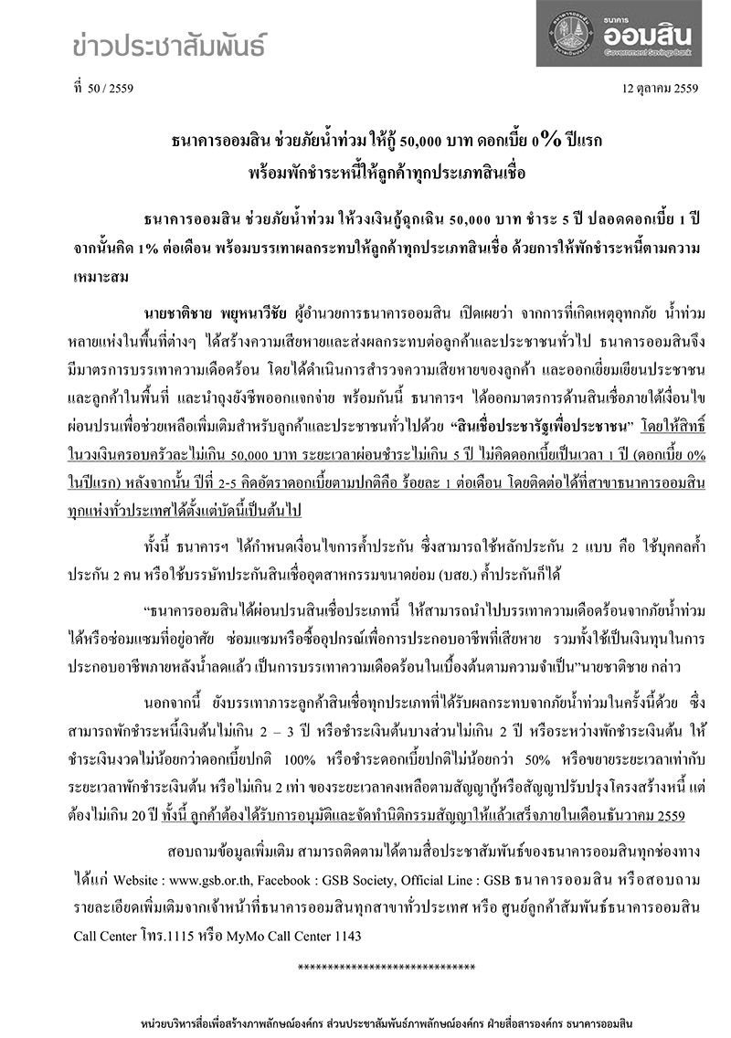 ธนาคารออมสิน ช่วยภัยน้ำท่วม ให้กู้ 50,000 บาท ดอกเบี้ย 0% ปีแรก พร้อมพักชำระหนี้ให้ลูกค้าทุกประเภทสินเชื่อ