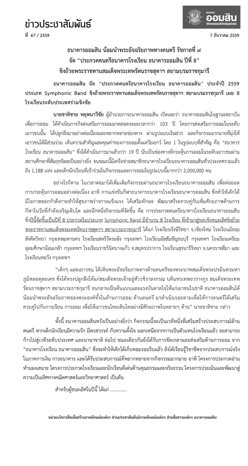 ธนาคารออมสิน น้อมนำพระอัจฉริยภาพทางดนตรี รัชกาลที่ ๙