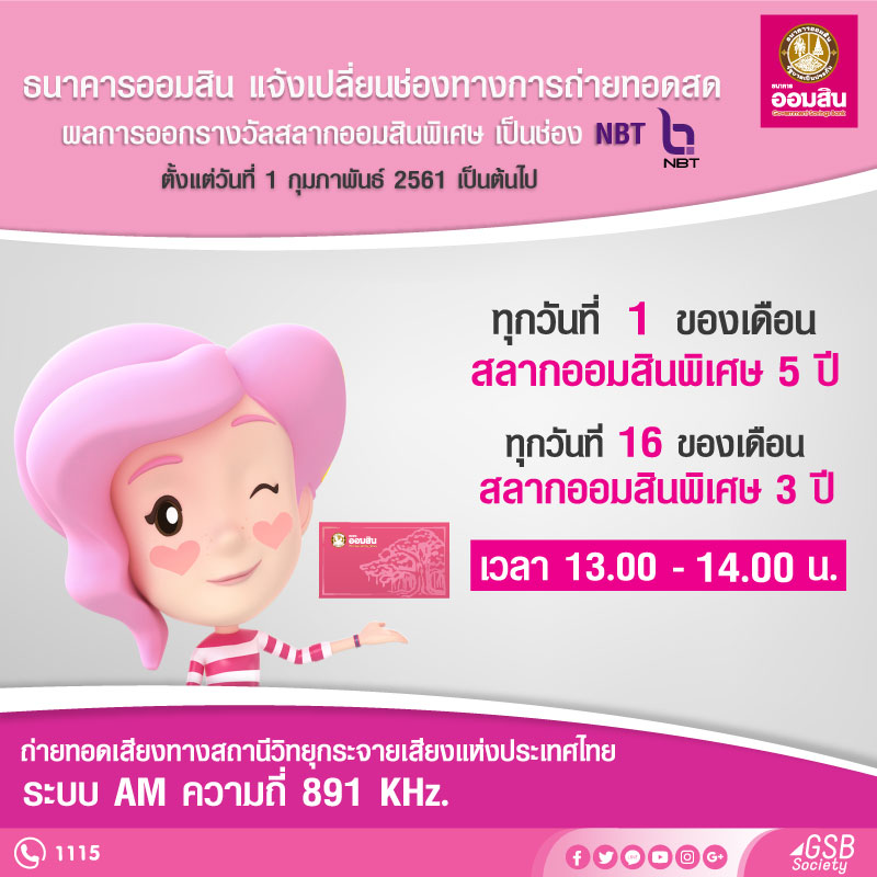 ธนาคารออมสิน แจ้งเปลี่ยนช่องทางการถ่ายทอดสดผลการออกรางวัลสลากออมสินพิเศษ - ธนาคารออมสิน