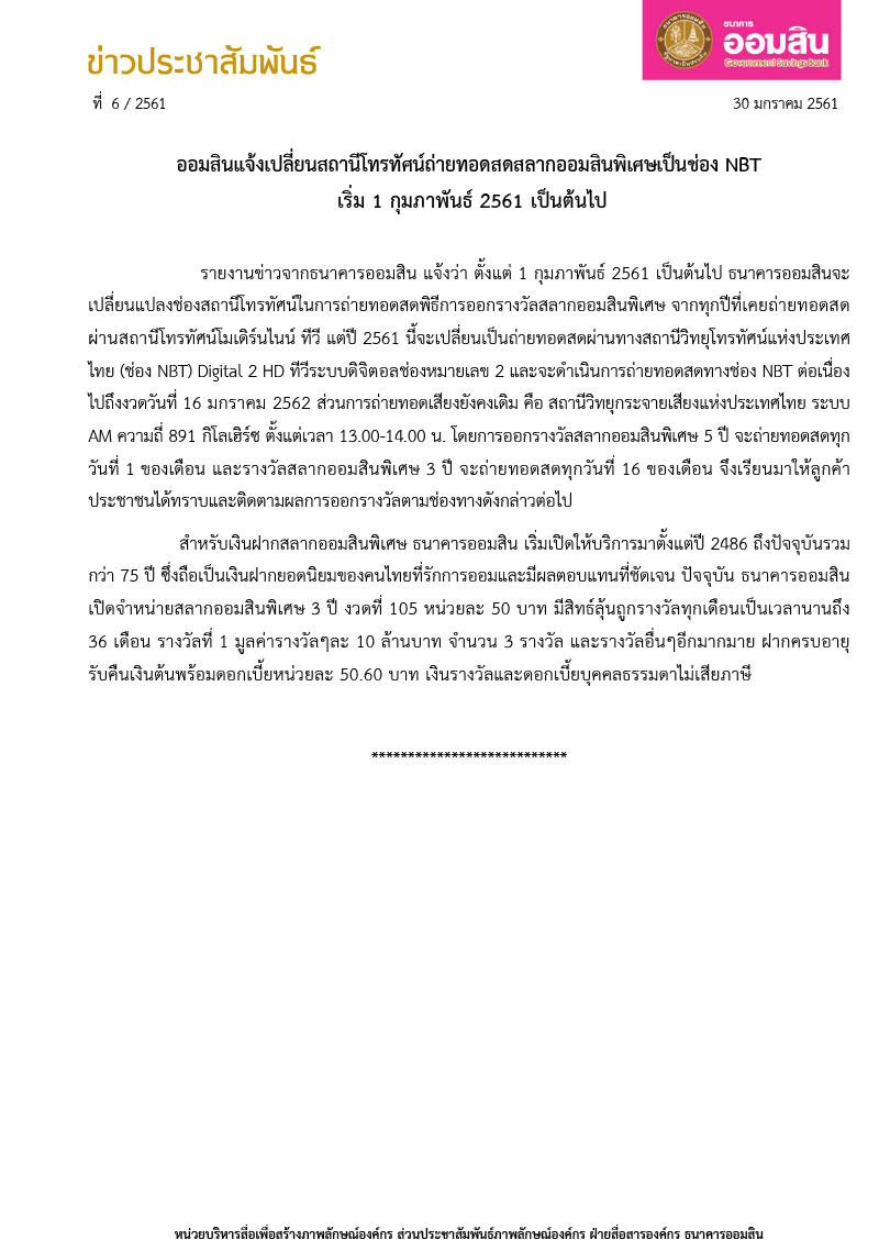 หน้าหลัก > News > ข่าวประชาสัมพันธ์ > ธนาคารออมสิน แจ้งเปลี่ยนช่องทางการถ่ายทอดสดผลการออกรางวัลสลากออมสินพิเศษ