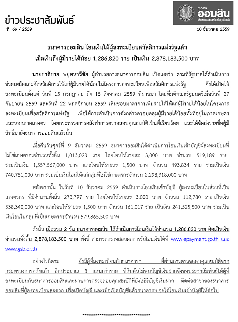 ธนาคารออมสิน โอนเงินให้ผู้ลงทะเบียนสวัสดิการแห่งรัฐแล้ว