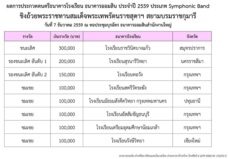 ผลการประกวดดนตรีธนาคารโรงเรียน ประเภท Symphonic Band ประจำปี 2559