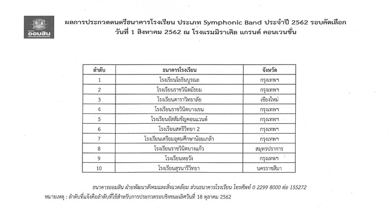ผลการประกวดดนตรีธนาคารโรงเรียน ธนาคารออมสิน ประเภท Symphonic Band ประจำปี 2562