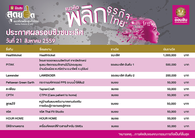 ผลการประกวดรอบชิงชนะเลิศ โครงการประกวด "ออมสิน สุดยอดแนวคิดพลิกธุรกิจไทย" - ธนาคารออมสิน