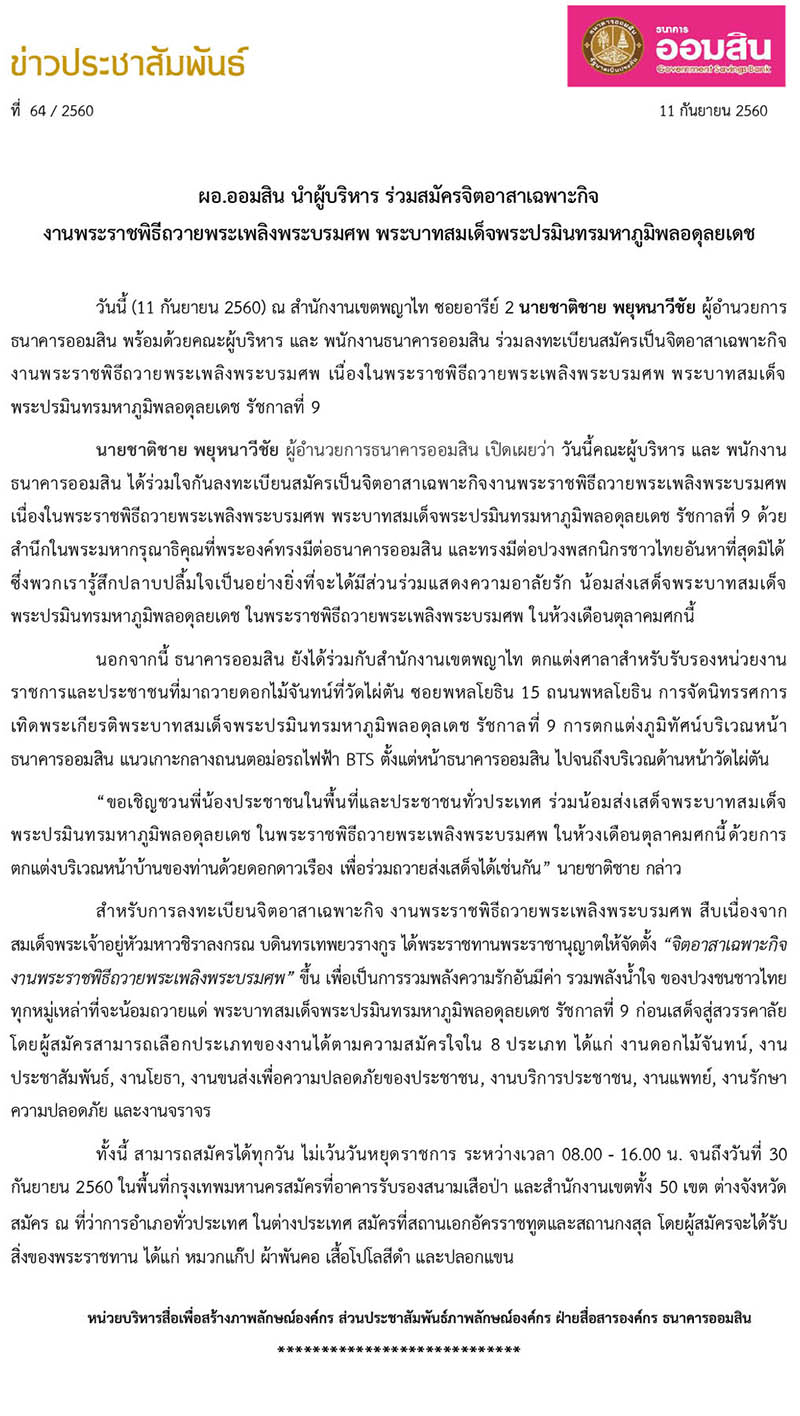 ผู้อำนวยการธนาคารออมสิน นำผู้บริหาร ร่วมสมัครจิตอาสาเฉพาะกิจ งานพระราชพิธีถวายพระเพลิงพระบรมศพ พระบาทสมเด็จพระปรมินทรมหาภูมิพลอดุลยเดช - ธนาคารออมสิน