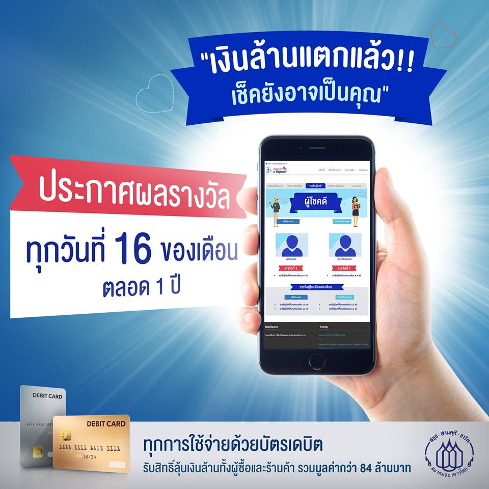 พบผลรางวัลเงินล้านได้อีก ทุกวันที่ 16 ทุกเดือน ตลอดทั้งปี เพียงใช้จ่ายด้วยบัตรเดบิตแทนเงินสด ก็ได้ลุ้นเป็นเศรษฐีกันถ้วนหน้าทั้งผู้ซื้อและร้านค้าที่รับบัตรเดบิต โอกาสมาแล้ว อย่าช้า!