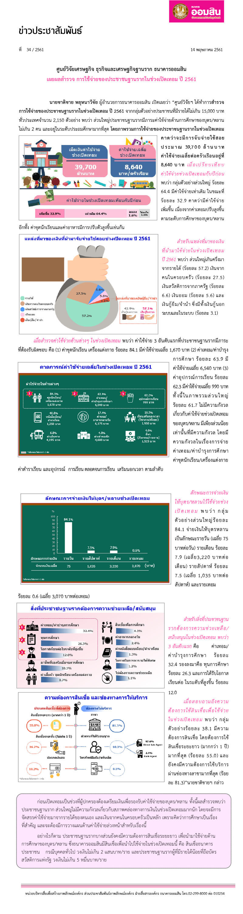 ศูนย์วิจัยเศรษฐกิจ ธุรกิจและเศรษฐกิจฐานราก ธนาคารออมสิน เผยผลสำรวจ การใช้จ่ายของประชาชนฐานรากในช่วงเปิดเทอม ปี 2561 - ธนาคารออมสิน