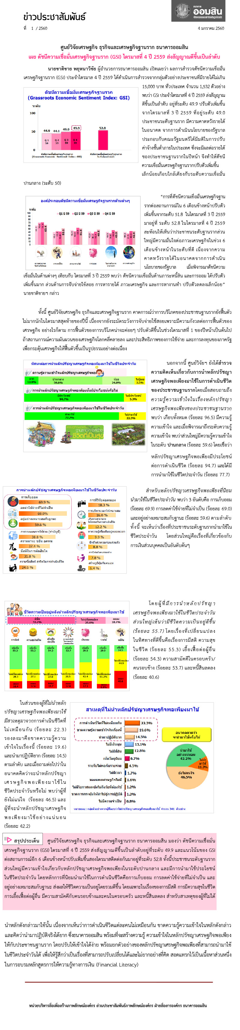 หน้าหลัก > News > ข่าวประชาสัมพันธ์ > ศูนย์วิจัยเศรษฐกิจ ธุรกิจและเศรษฐกิจฐานราก ธนาคารออมสิน เผย ดัชนีความเชื่อมั่นเศรษฐกิจฐานราก (GSI) ไตรมาสที่ 4 ปี 2559 ส่งสัญญาณดีขึ้นเป็นลำดับ