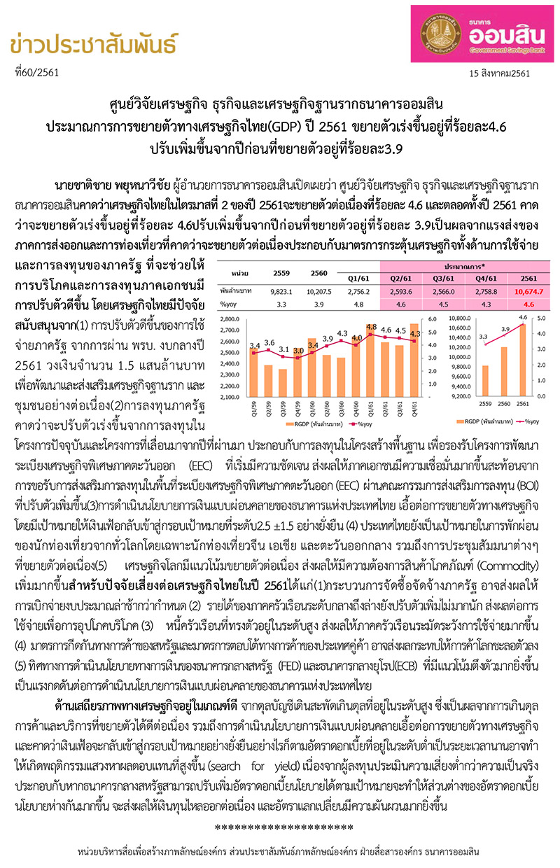 ศูนย์วิจัยเศรษฐกิจ ธุรกิจและเศรษฐกิจฐานรากธนาคารออมสิน ประมาณการการขยายตัวทางเศรษฐกิจไทย(GDP) ปี 2561 ขยายตัวเร่งขึ้นอยู่ที่ร้อยละ4.6