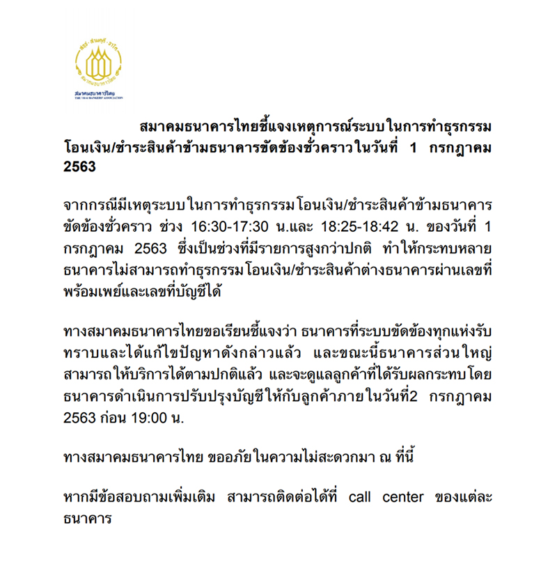 สมาคมธนาคารไทยชี้แจงเหตุการณ์ระบบในการทำธุรกรรม โอนเงิน/ชำระสินค้าข้ามธนาคารขัดข้องชั่วคราวในวันที่ 1 กรกฎาคม 2563