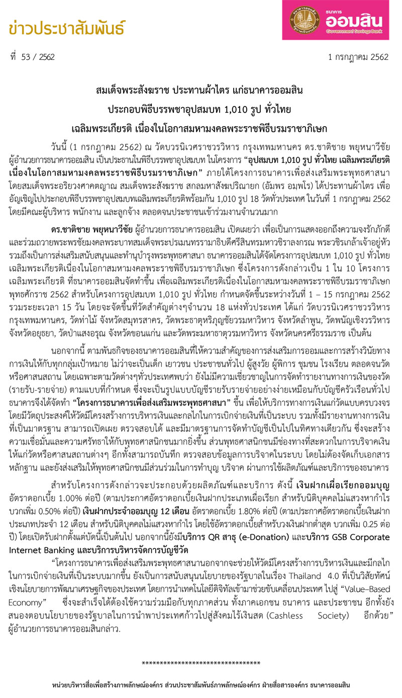 สมเด็จพระสังฆราช ประทานผ้าไตร แก่ธนาคารออมสิน ประกอบพิธีบรรพชาอุปสมบท 1,010 รูป ทั่วไทย เฉลิมพระเกียรติ เนื่องในโอกาสมหามงคลพระราชพิธีบรมราชาภิเษก - ธนาคารออมสิน