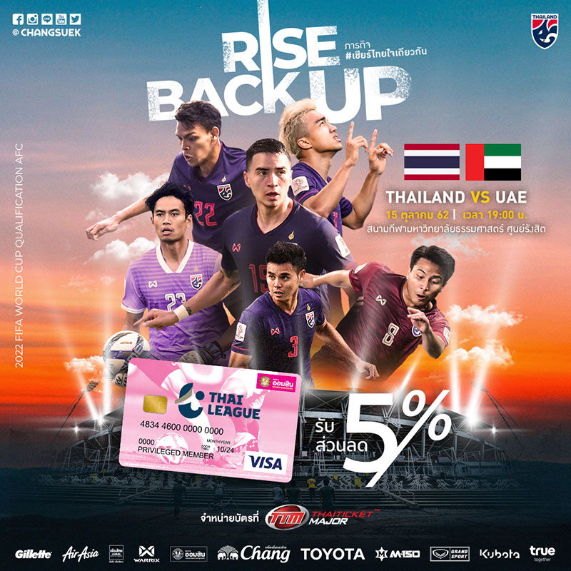 Rise Back Up ภารกิจ #เชียร์ไทยใจเดียวกันฟุตบอลโลกรอบคัดเลือก โซนเอเชีย รอบสอง นัดที่สาม กลุ่มจี ทีมชาติไทย พบ ทีมชาติสหรัฐอาหรับเอมิเรสต์ วันที่ 15 ตุลาคม 62 เวลา 19.00 น. ณ สนามกีฬามหาวิทยาลัยธรรมศาสตร์ ศูนย์รังสิตจำหน่ายบัตรไทยทิคเก็ตเมเจอร์ ผู้ถือบัตรออมสิน เดบิต ไทยลีก สามารถซื้อได้ที่เคาน์เตอร์ของไทยทิคเก็ตเมเจอร์เท่านั้น
