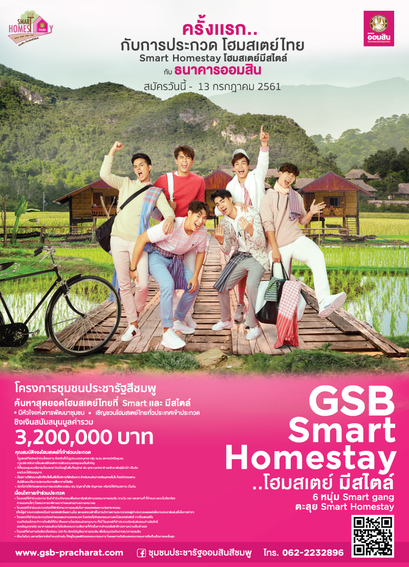 ธนาคารออมสินส่งเสริมชุมชนด้านการท่องเที่ยว หลังประสบความสำเร็จจากการเฟ้นหาชุมชนต้นแบบ ชุมชนประชารัฐสีชมพู 2 ปีก่อน ปีนี้จัดประกวดโฮมสเตย์ระดับประเทศ“GSB Smart Homestay โฮมสเตย์มีสไตล์” ครั้งแรกของการประกวดโฮมสเตย์ไทยที่มีหัวใจแห่งการพัฒนา สามารถยกระดับการท่องเที่ยวชุมชนให้เข้มแข็งคนในชุมชนมีคุณภาพชีวิตที่ดีขึ้น ชิงเงินรางวัลสนับสนุนมูลค่ารวม 3,200,000 บาท