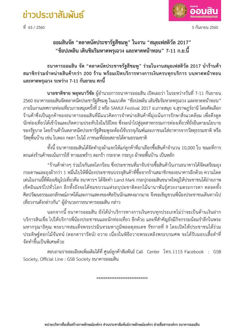 ออมสินจัด “ตลาดนัดประชารัฐสีชมพู” ในงาน “สมุยเฟสติวัล 2017” “ช็อปเพลิน เดินชิมริมหาดพรุเฉวง” และหาดหน้าทอน 7-11 ก.ย. นี้