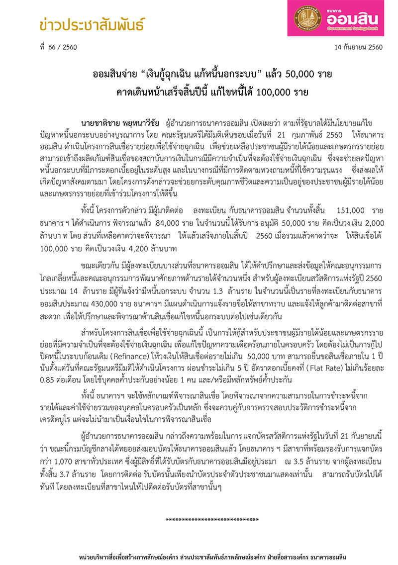 หน้าหลัก > News > ข่าวประชาสัมพันธ์ > ออมสินจ่าย “เงินกู้ฉุกเฉิน แก้หนี้นอกระบบ” แล้ว 50,000 ราย คาดเดินหน้าเสร็จสิ้นปีนี้ แก้ไขหนี้ได้ 100,000 ราย