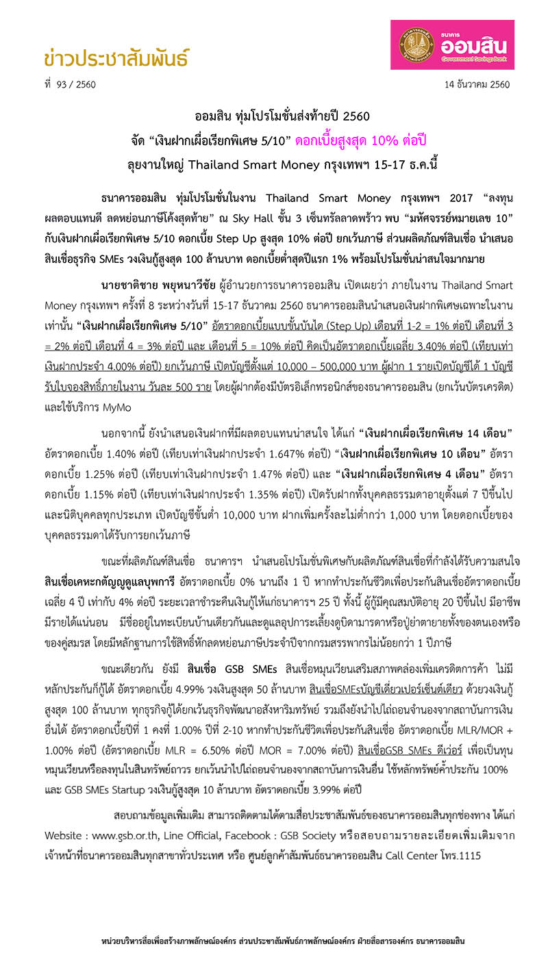 ออมสินทุ่มโปรโมชั่นส่งท้ายปี 2560 จัด “เงินฝากเผื่อเรียกพิเศษ 5/10” ดอกเบี้ยสูงสุด 10% ต่อปี - ธนาคารออมสิน