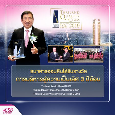 เมื่อวันพฤหัสบดีที่ 20 กุมภาพันธ์ พ.ศ. 2563 ดร.ชาติชาย พยุหนาวีชัย ผู้อำนวยการธนาคารออมสิน รับรางวัลการบริหารสู่ความเป็นเลิศที่มีความโดดเด่นด้านการปฏิบัติการ ประจำปี 2562 (Thailand Quality Class Plus: Operation – TQC+: Operation) จากคุณกอบชัย สังสิทธิสวัสดิ์ ปลัดกระทรวงอุตสาหกรรม ประธานในพิธีมอบรางวัลคุณภาพแห่งชาติ ประจำปี 2562 (Thailand Quality Award : TQA) โดยมีคุณปิยะบุตร ชลวิจารณ์ ประธานคณะกรรมการรางวัลคุณภาพแห่งชาติ ดร.พานิช เหล่าศิริรัตน์ ผู้อำนวยการสถาบันเพิ่มผลผลิตแห่งชาติ คณะผู้บริหารธนาคารออมสิน และสื่อมวลชนจำนวนมาก เข้าร่วมในพิธีมอบรางวัลดังกล่าว ซึ่งกระทรวงอุตสาหกรรม โดยสถาบันเพิ่มผลผลิตแห่งชาติในฐานะสำนักงานรางวัลคุณภาพแห่งชาติจัดขึ้น ณ ศูนย์นิทรรศการและการประชุมไบเทค บางนา กรุงเทพฯ