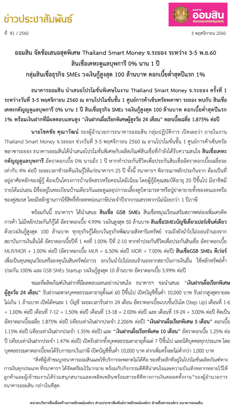 ออมสิน จัดข้อเสนอสุดพิเศษ Thailand Smart Money จ.ระยอง ระหว่าง 3-5 พ.ย.60
