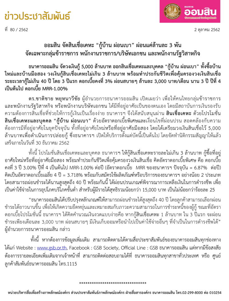 ออมสิน จัดสินเชื่อเคหะ “กู้บ้าน ผ่อนเบา” ผ่อนแค่ล้านละ 3 พัน จัดเฉพาะกลุ่มข้าราชการ พนักงานราชการ/บริษัทเอกชน และพนักงานรัฐวิสาหกิจ