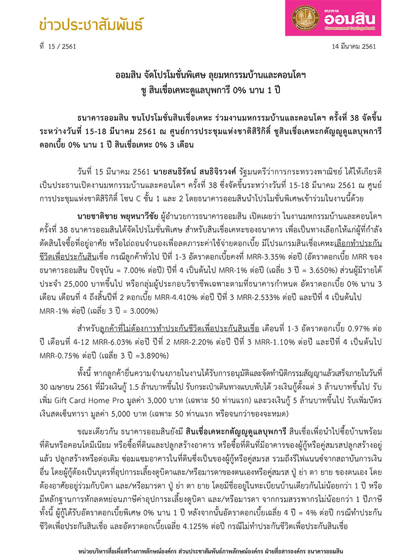 ออมสิน จัดโปรโมชั่นพิเศษ ลุยมหกรรมบ้านและคอนโดฯ ชู สินเชื่อเคหะดูแลบุพการี 0% นาน 1 ปี