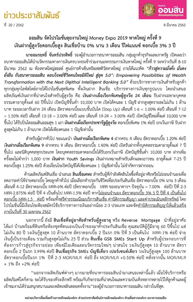 ออมสิน จัดโปรโมชั่นลุยงานใหญ่ Money Expo 2019 หาดใหญ่ ครั้งที่ 9
