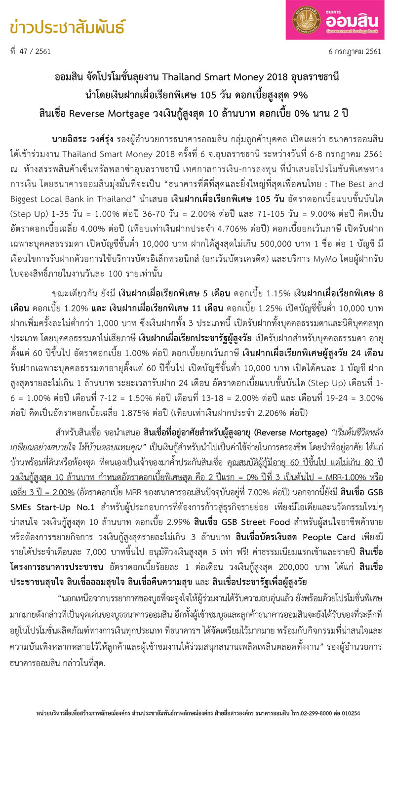 ออมสิน จัดโปรโมชั่นลุยงาน Thailand Smart Money 2018 อุบลราชธานี