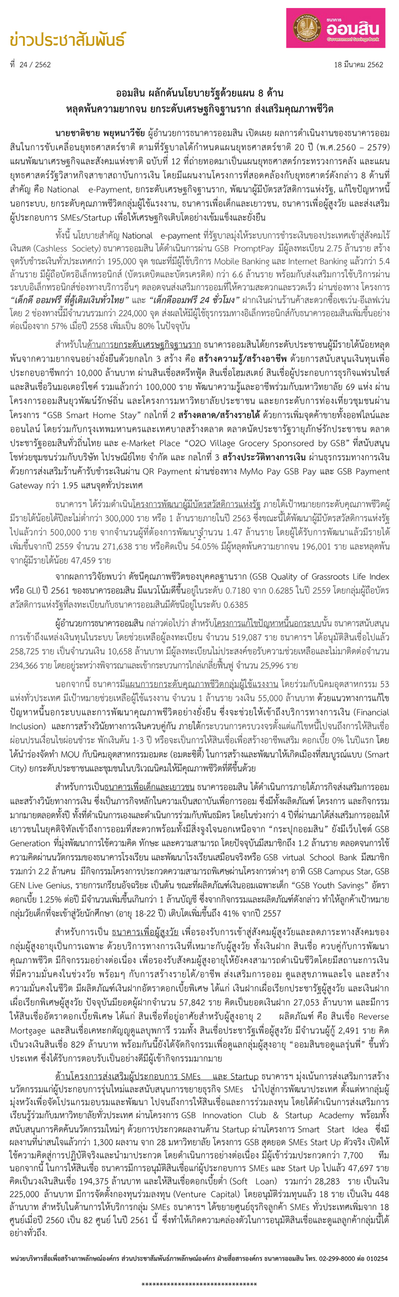 ออมสิน ผลักดันนโยบายรัฐด้วยแผน 8 ด้าน หลุดพ้นความยากจน ยกระดับเศรษฐกิจฐานราก ส่งเสริมคุณภาพชีวิต