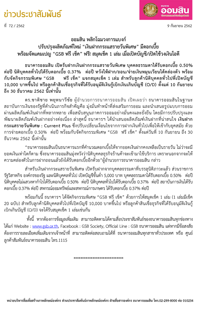 ออมสิน พลิกโฉมวงการแบงก์ ปรับปรุงผลิตภัณฑ์ใหม่ “เงินฝากกระแสรายวันพิเศษ” มีดอกเบี้ย พร้อมจัดแคมเปญ “GSB ฟรี เช็ค” ฟรี! สมุดเช็ค 1 เล่ม เมื่อเปิดบัญชี/เปิดใช้วงเงินโอดี