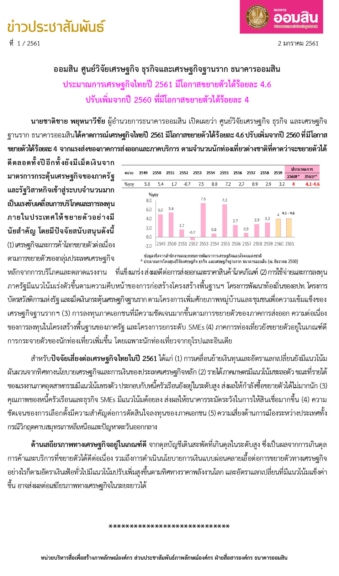 ออมสิน ศูนย์วิจัยเศรษฐกิจ ธุรกิจและเศรษฐกิจฐานราก ธนาคารออมสิน ประมาณการเศรษฐกิจไทยปี 2561 มีโอกาสขยายตัวได้ร้อยละ 4.6