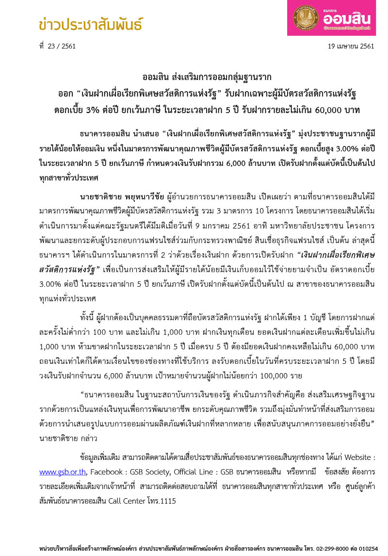 ออมสิน ส่งเสริมการออมกลุ่มฐานราก ออก “เงินฝากเผื่อเรียกพิเศษสวัสดิการแห่งรัฐ”