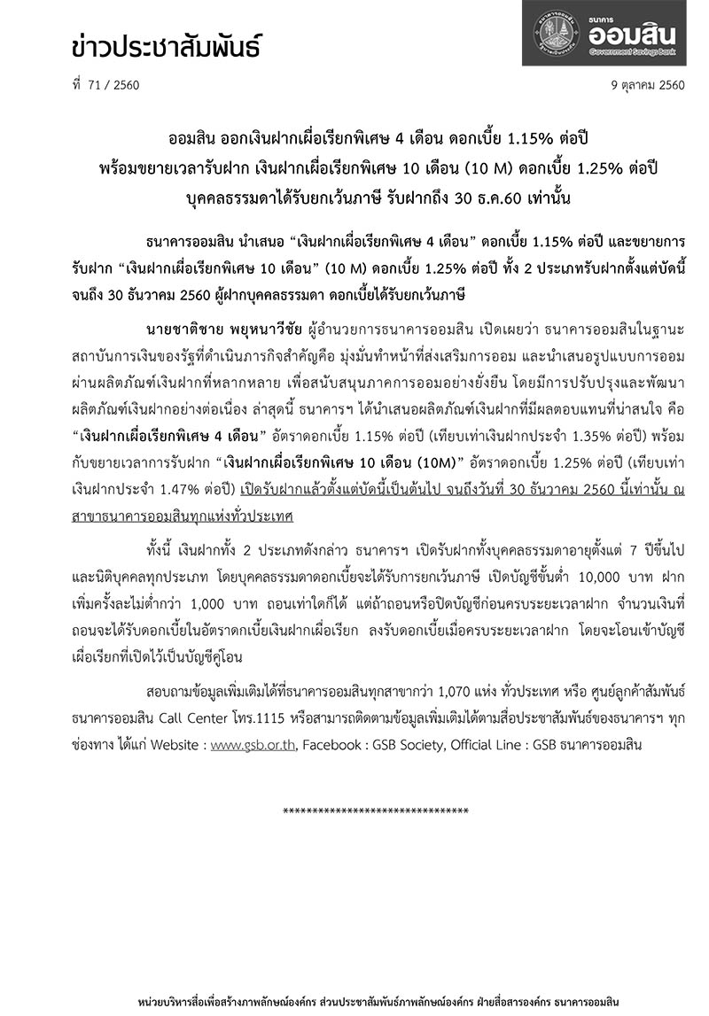 ออมสิน ออกเงินฝากเผื่อเรียกพิเศษ 4 เดือน ดอกเบี้ย 1.15% ต่อปี - ธนาคารออมสิน