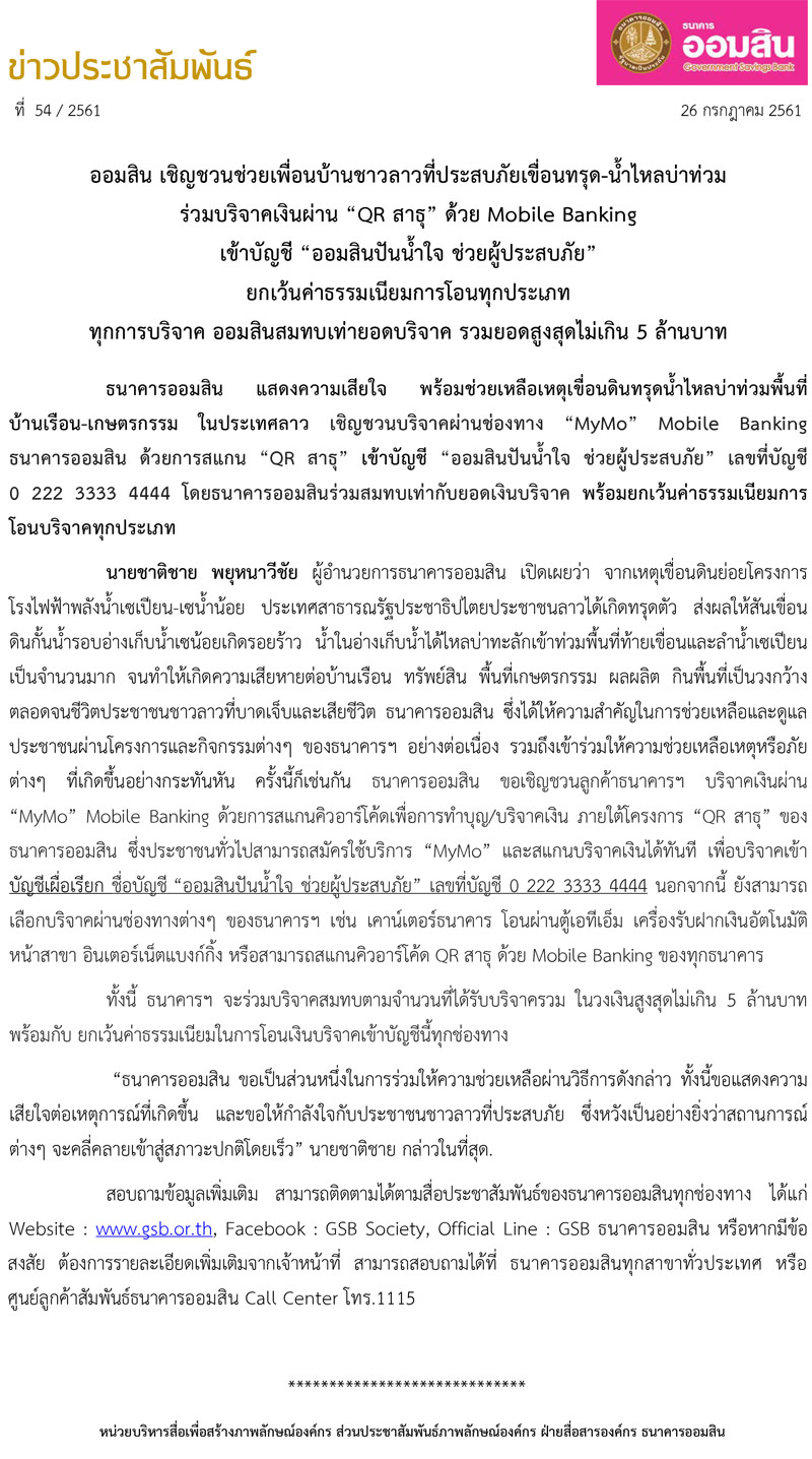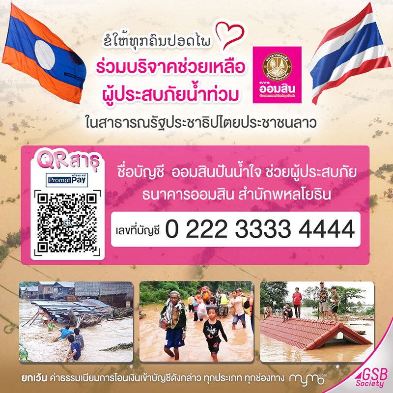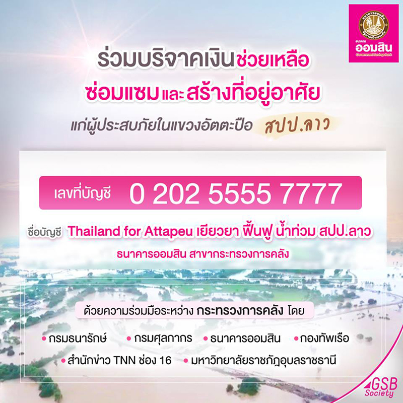 อีกหนึ่งช่องทางในการบริจาคเงินเพื่อช่วยเหลือเยียวยา ฟื้นฟู ผู้ประสบภัยน้ำท่วม ใน สปป.ลาว ผ่านบัญชี “Thailand for Attapeu เยียวยา ฟื้นฟู น้ำท่วม สปป. ลาว” ด้วยความร่วมมือของ หน่วยงานในสังกัดกระทรวงการคลัง และหน่วยงานพันธมิตร โดย
