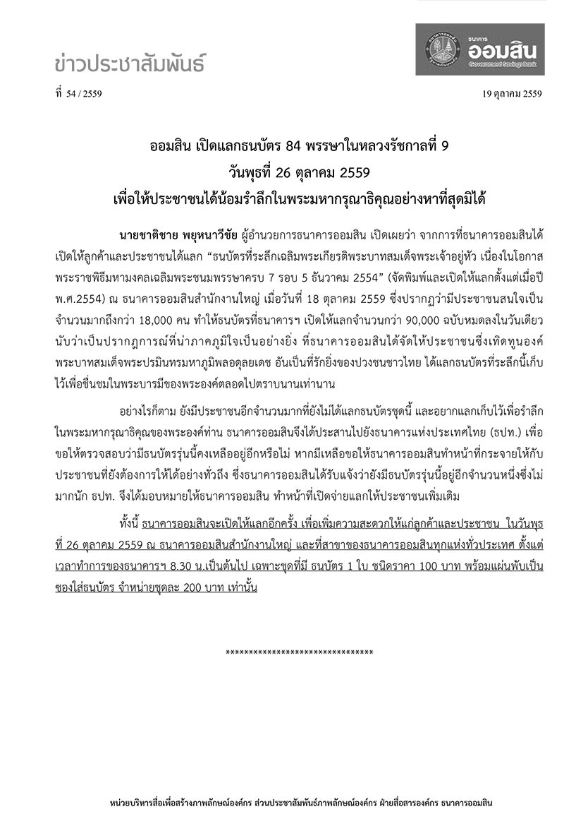 ออมสิน เปิดแลกธนบัตร 84 พรรษาในหลวงรัชกาลที่ 9 วันพุธที่ 26 ตุลาคม 2559 เพื่อให้ประชาชนได้น้อมรำลึกในพระมหากรุณาธิคุณอย่างหาที่สุดมิได้