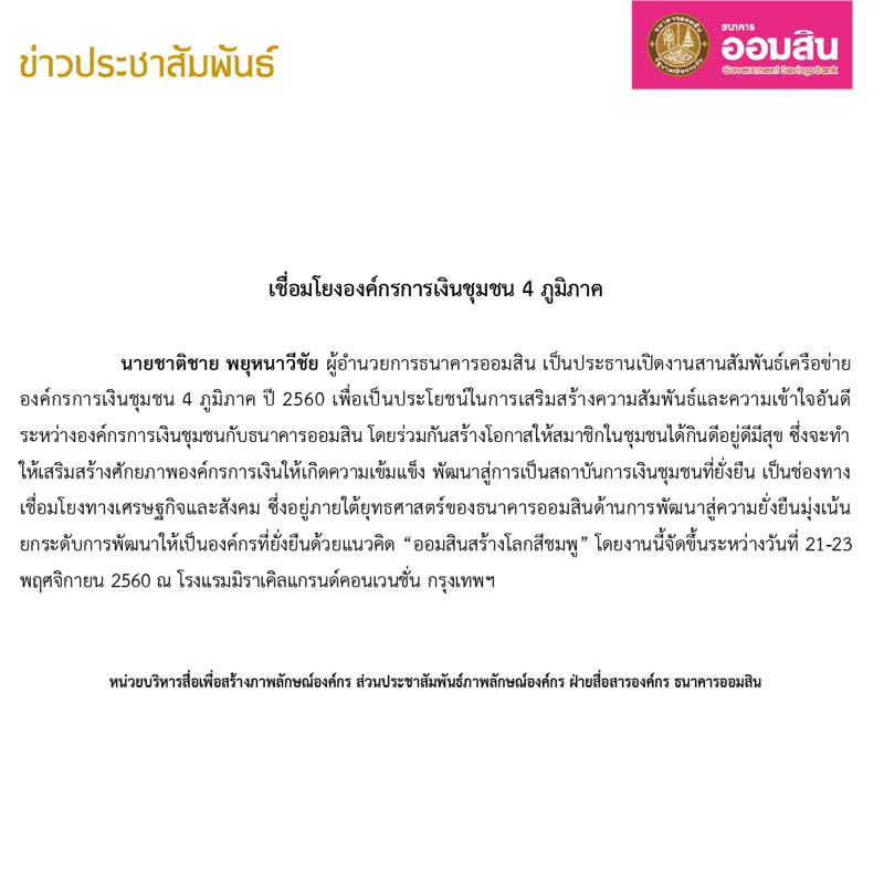 เชื่อมโยงองค์กรการเงินชุมชน 4 ภูมิภาค - ธนาคารออมสิน