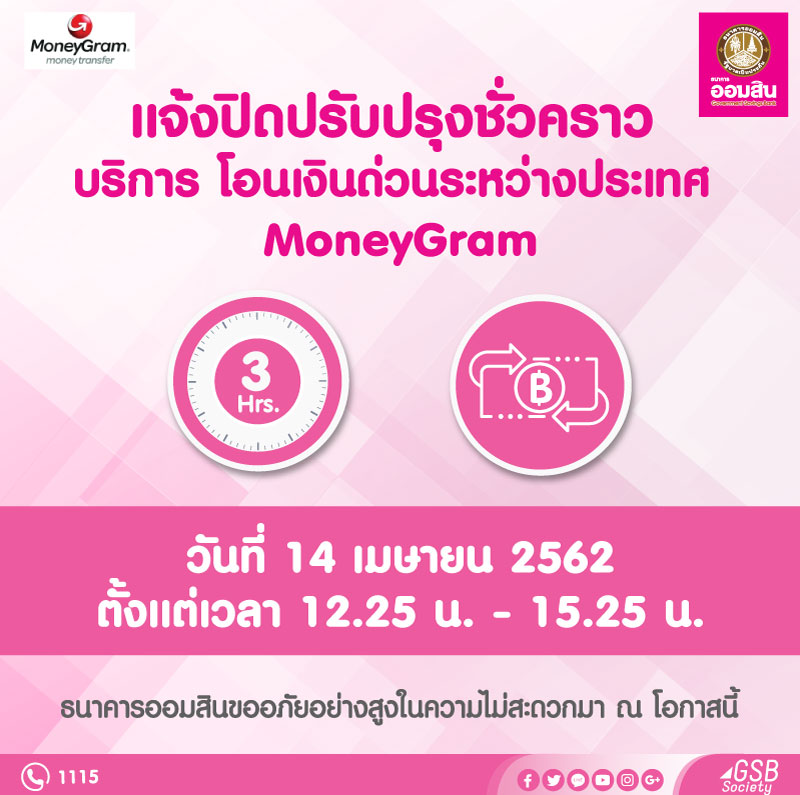แจ้งปิดปรับปรุงชั่วคราว บริการโอนเงินด่วนระหว่างประเทศ MoneyGram