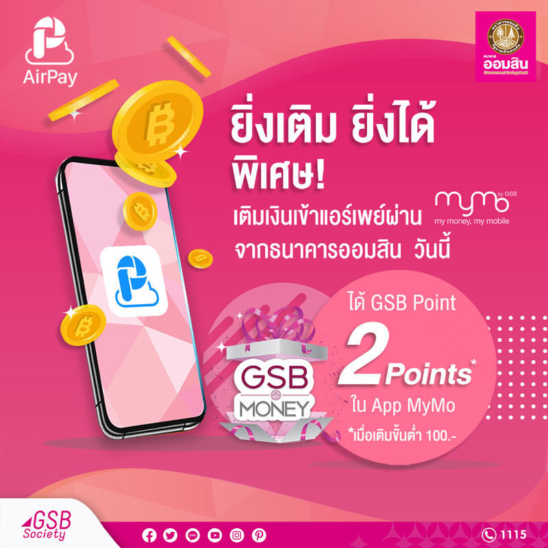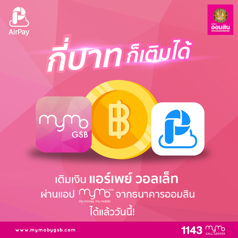 หน้าหลัก > Promotion > Online Promotion > เติมเงินเข้าแอร์เพย์ วอลเล็ท ผ่านแอป MyMo จากธนาคารออมสิน