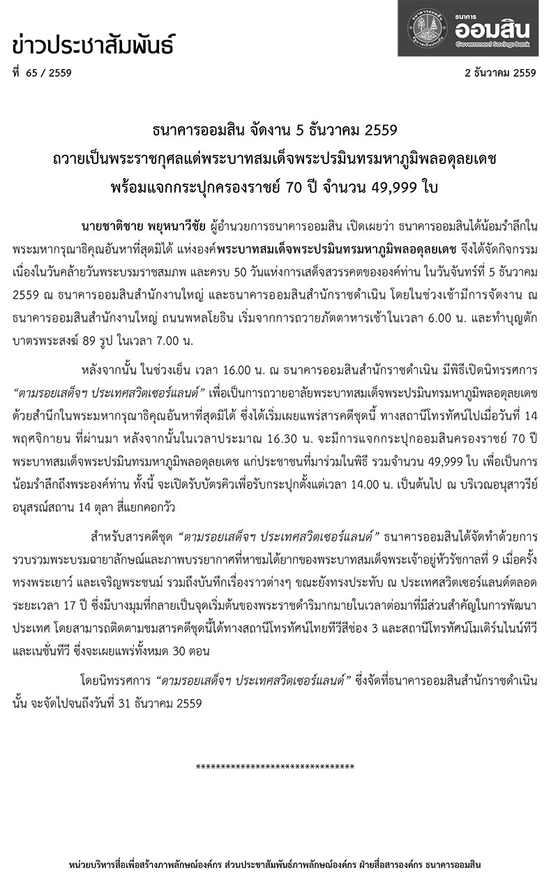 ธนาคารออมสิน จัดงาน 5 ธันวาคม 2559 ถวายเป็นพระราชกุศลแด่พระบาทสมเด็จพระปรมินทรมหาภูมิพลอดุลยเดช พร้อมแจกกระปุกครองราชย์ 70 ปี จำนวน 49,999 ใบ