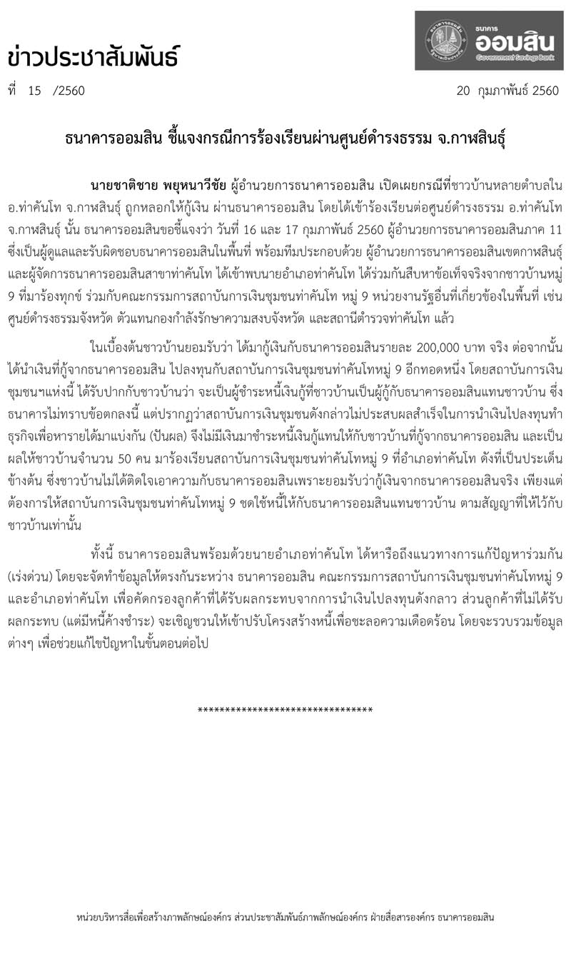 ธนาคารออมสิน ชี้แจงกรณีการร้องเรียนผ่านศูนย์ดำรงธรรม จ.กาฬสินธุ์