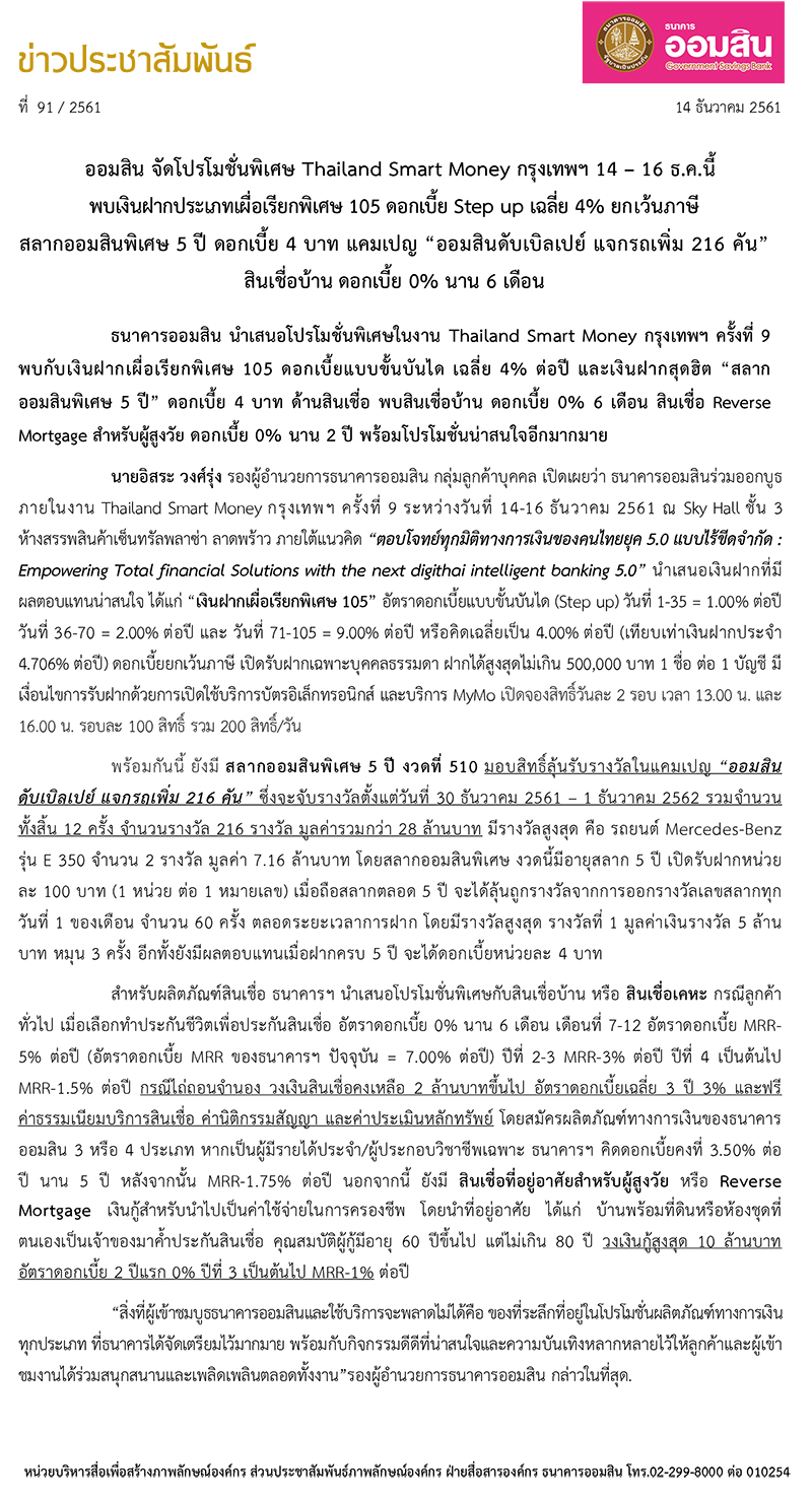ธนาคารออมสิน นำเสนอโปรโมชั่นพิเศษในงาน Thailand Smart Money กรุงเทพฯ ครั้งที่ 9