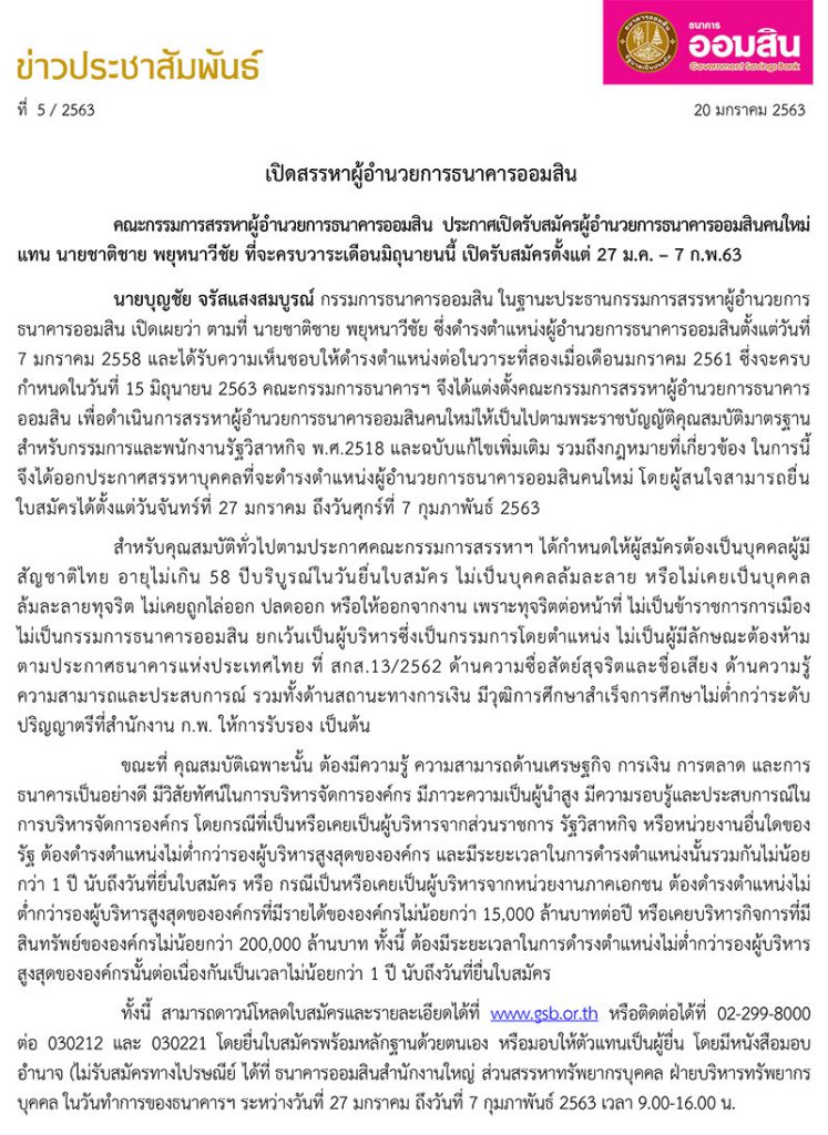 ธนาคารออมสิน ประกาศเปิดรับสมัครผู้อำนวยการธนาคารออมสินคนใหม่
